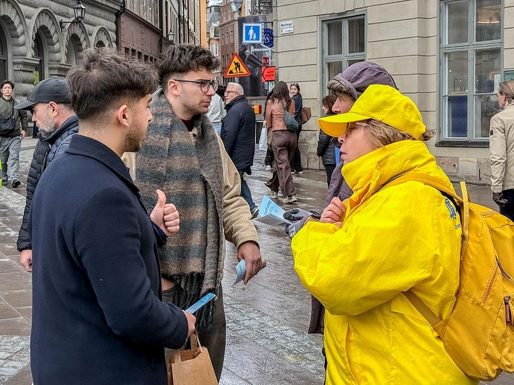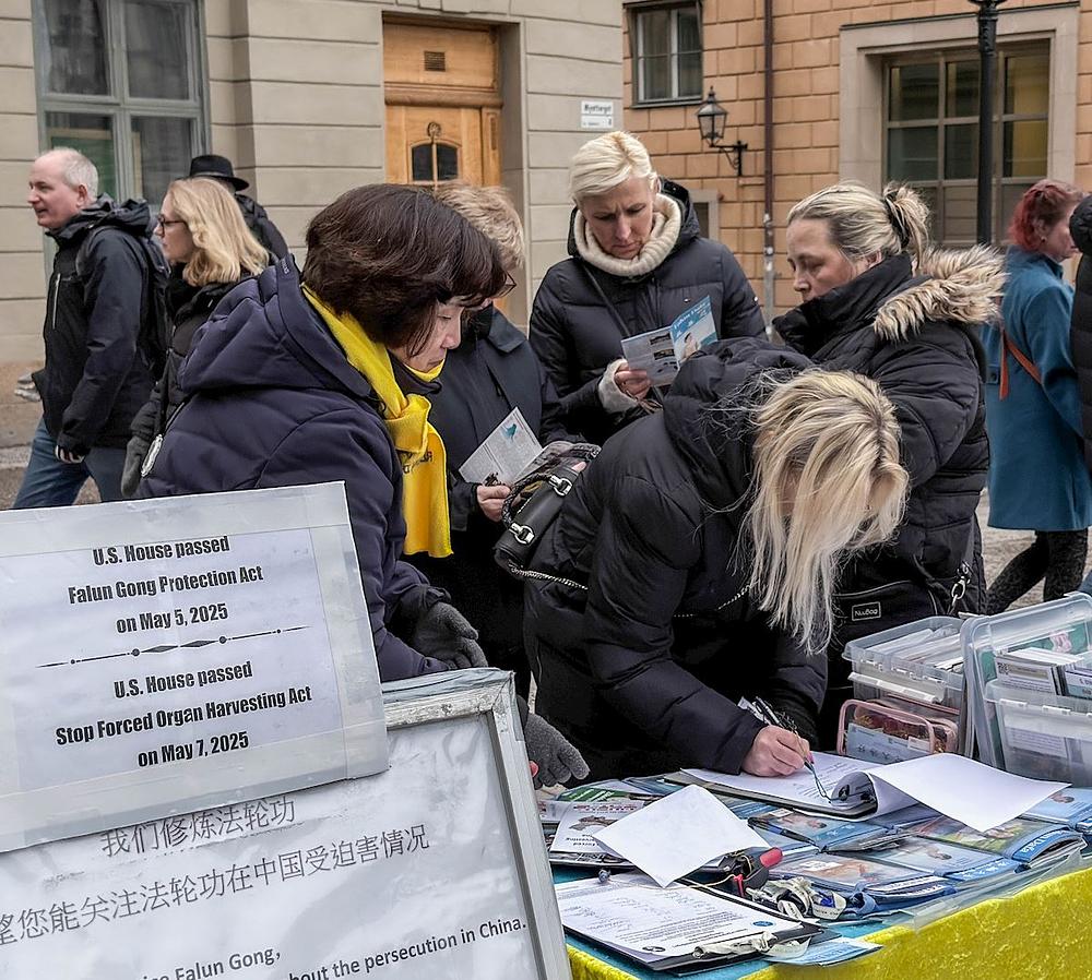 Praktikanti su takođe održali događaj pored zgrade parlamenta u centru Stokholma 25. aprila 2026. godine. Oni su ljudima govorili o progonu od strane KPK i državnom prisilnom vađenju organa, kao i o transnacionalnoj represiji. Pozvali su švedski narod da pomogne u zaustavljanju ovih kršenja ljudskih prava.