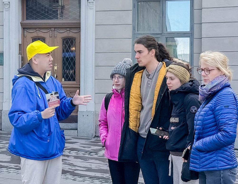 Dok je žena šetala travnjakom preko puta kineske ambasade u Stokholmu, praktikantkinja Falun Dafe joj je uručila flajer. Žena ga je prihvatila i rekla da je čula za kršenja ljudskih prava u Kini, ali da smatra da mediji mnoge stvari ne izveštavaju.