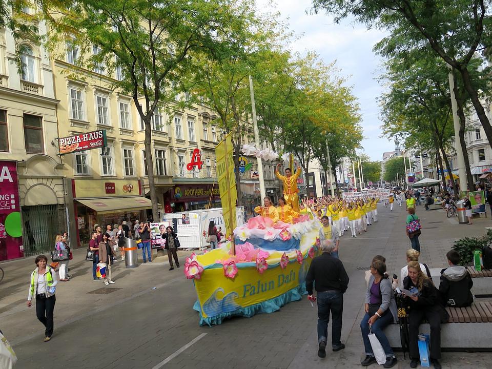 Evropski „Divine Land Marching Band“ je predvodio trosatnu povorku koja se kretala centrom Beča, a koja je krenula sa trga Stephansplatz. Gledatelje su također zabavljali i grupa zmajevog plesa kao i „nebeske djevojke“, dok je izvođenje Falun Gong vježbi u pokretnom brodu oslikavalo miroljubivi karakter Falun Gonga.