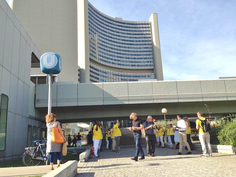 Falun Gong praktikanti podizali su svijest o progonu ispred Vienna International Center u Austriji 18. septembra 2015. Držali su transparente i postavili plakate da bi dostavili svoju poruku. Neki praktikanti su demonstrirali Falun Gong vježbe, neki su objašnjavali činjenice o progonu, a drugi su prikupljali potpise kojima se osuđuje progon.