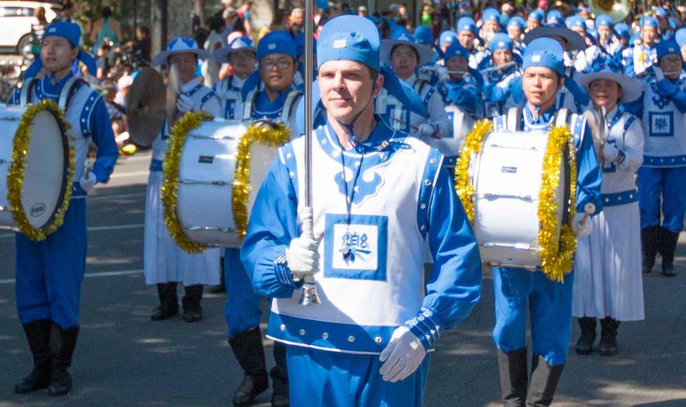 Falun Gong praktikanti, koji nastupaju u orkestru Divine Land Marching Band, su po četvrti puta uzeli učešće na 102. paradi prazničkog dana održanoj u kampusu kalifornijskog univerziteta Davis, 16. aprila 2016. godine.