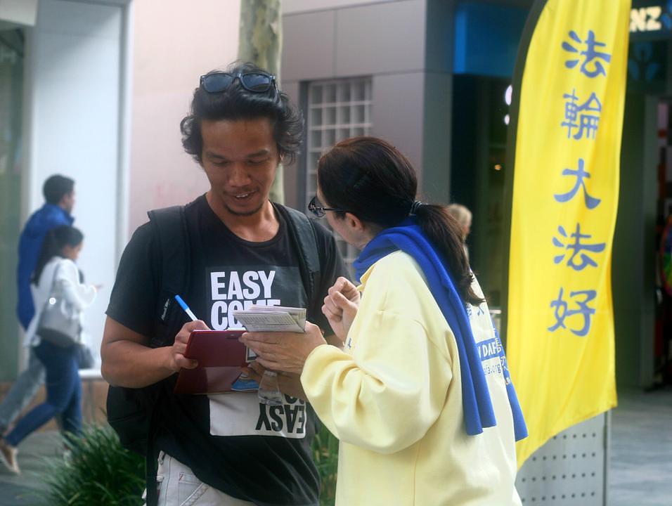 Troje kineza su pokušali izbjeći praktikante koji su im htjeli uručiti informacije. Jedan im je praktikant kazao: „Čitanje Falun Gong materijala ovdje (u Australiji) nije zabranjeno. Slobodno ih možete pogledati. Ovdje ste u slobodnom društvu. Zašto ne iskoristite šansu da saznate šta je u stvari Falun Gong?“