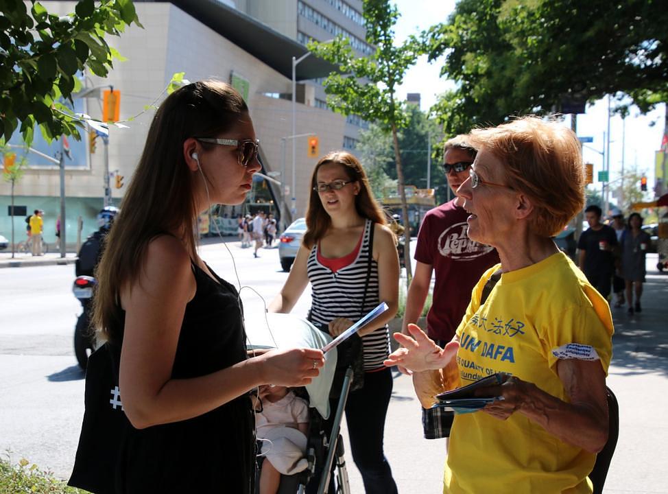Olga iz Rusije je bila jedna od njih. „U Rusiji sam bila medijski reporter i znam kako je to u komunističkim zemljama“, kazala je praktikantu. „Čudno sam se osjećala kada sam na plakatima pročitala riječi 'Zaustavite progon'. No, kada sam pročitala da je bilo više praktikanta Falun Gonga nego članova Komunističke partije u Kini, shvatila sam zašto su vlasti pokrenule progon.“