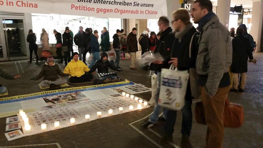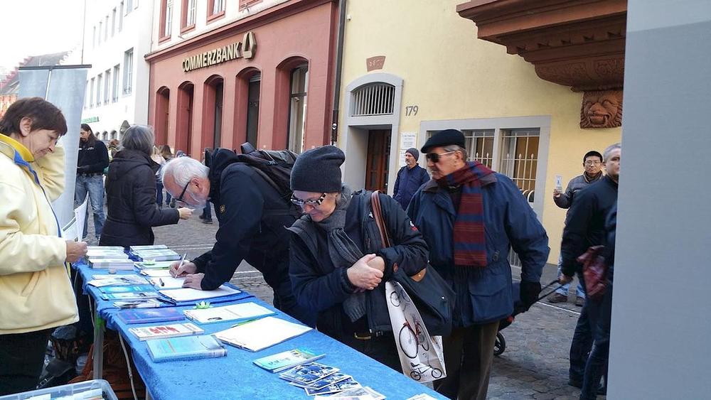 Praktikanti Falun Gonga iz Njemačke i Švajcarske su se 10. decembra okupili u Freiburgu da bi skrenuli pažnju na progon i prikupljali potpise na peticiju.