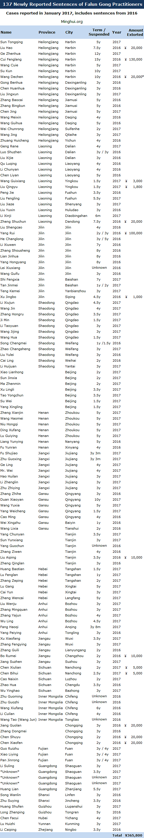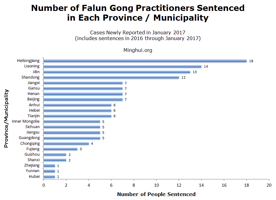 U skladu sa informacijama prikupljenim od strane Minghui.org, u mjesecu januaru 2017. godine zabilježeno je 137 novih slučajeva praktikanata Falun Gonga osuđenih na zatvorske kazne od strane sudskog sistema Kineske komunističke partije (KKP).