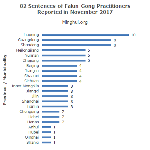 Budući je Minghui.org vodeće mjesto za evidentiranje izvještaja o progonu Falun Gonga, on svakog mjeseca bilježi informacije u vezi sa bespravnim presudama praktikantima. U novembru mjesecu 2017. godine Minghui.org je potvrdio 82 bespravne presude izrečene praktikantima, uključujući i 30 slučajeva koji su se desili između marta i oktobra i 52 slučaja zabilježena u novembru. Prosječna visina presude je 2,7 godina zatvora.