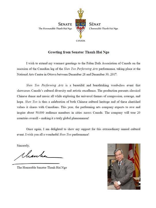 Senator Thanh Hai Ngo je kazao: "Shen Yun Performing Arts je prekrasan događaj svjetskog nivoa koji oduzima dah i koji pokazuje kanadsku kulturnu raznolikost, a također i vrhunsku umjetnost. Produkcija prikazuje klasični kineski ples i muziku, dok istovremeno istražuje univerzalne teme suosjećajnosti, hrabrosti i nade… Ove godine, ova trupa scenskih umjetnosti očekuje oduševljenje i nadahnuće auditorijuma od 50.000 gledalaca u gradovima širom Kanade. Ova će kompanija gostovati u dvadeset zemalja—postajući tako globalni fenomen!"