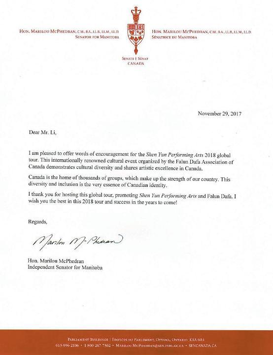 Senatorka Marilou McPhedron je kazala: "Kanada je dom hiljada (etničkih) grupa što čini našu Kanadu snažnom. Ova različitost i miješanje čine pravu suštinu kanadskog identiteta. Zahvaljujem se domaćinima ove globalne turneje, koji promoviraju Shen Yun Performing Arts i Falun Dafa!" Želim vam sve najbolje u vašoj turneji 2018. godine i u godinama koje dolaze!"