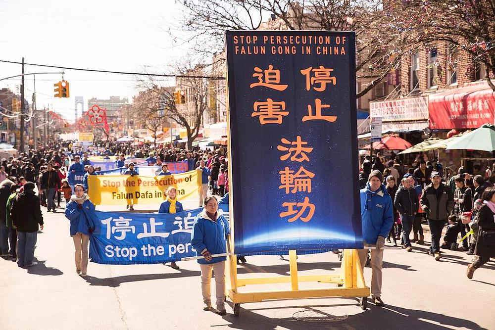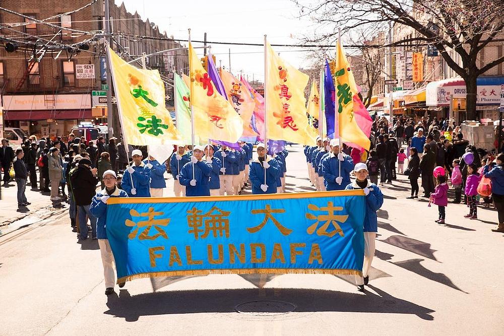 Praktikanti su održali višestruku paradu uzduž 8. avenije po kojoj su marširali 14 blokova. Gledaocima su predstavljeni tradicionalni zmajev i lavlji ples, lijepo ukrašena pokretna ostrva, uzbudljivi marširajući limeni orkestar i trijumfalna dobošarska grupa. Na paradi su bile nošene zastave i transparenti koji su govorili o koristi od prakticiranja ove prakse, o nepravednom progonu u Kini, kao i čestitke stotinama miliona kineskih građana koji su napustili Komunističku partiju Kine (KPK) i njoj pridružene organizacije.