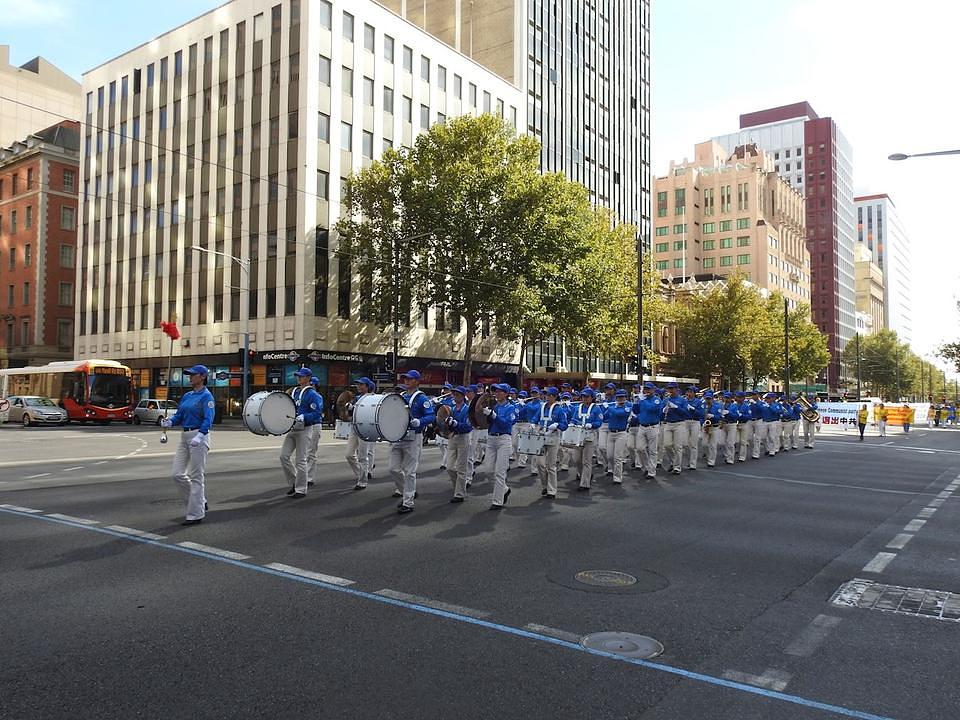 Tian Guo Marching Band, sastavljen do praktikanata Falun Gonga, je predvodio marš, koji je krenuo od zgrade vlade, išao duž puta King Williama kroz centar Adelaide, a završio se u Kineskoj četvrti.