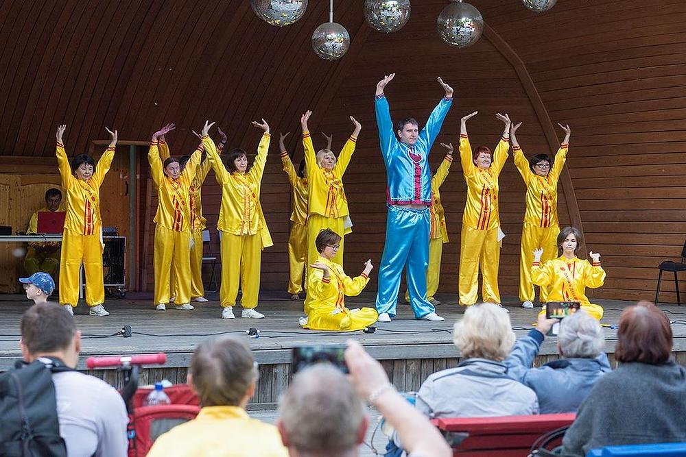Na pozornici je domaćin manifestacije predstavio Falun Dafa, kazavši da ga prakticiraju ljudi u više od 100 zemalja svijeta te da ga u Kini brutalno progoni tamošnji komunistički režim.
