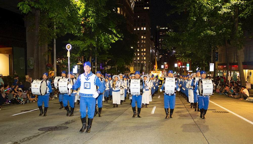 Kada je Falun Gong povorka prolazila pored bine, komentator iz KIRO 7 News je rekao: „Upravo započinjemo mitsko putovanje. Ovo je Falun Dafa! Falun Dafa je praksa za um i tijelo, koja slijedi principe „Istinitost-Dobrodušnost-Tolerancija." Stotinu miliona ljudi u više od 70 zemalja prakticira Falun Dafa. To je drevna praksa, ali je javnosti predstavljena 1992. godine."