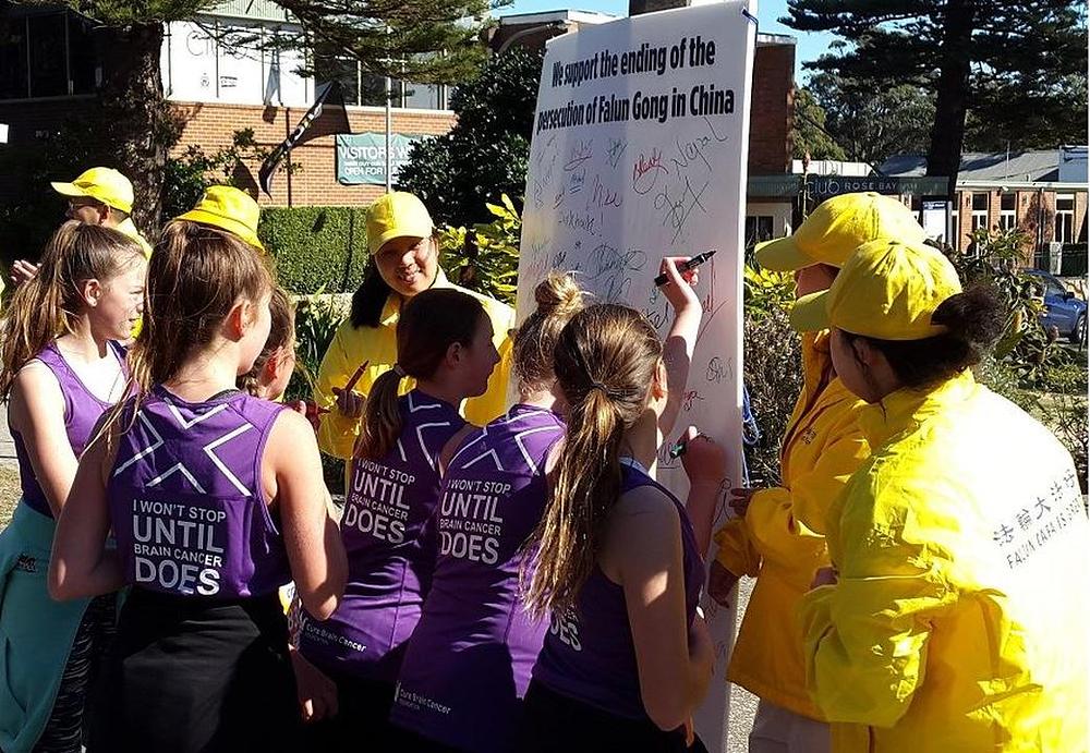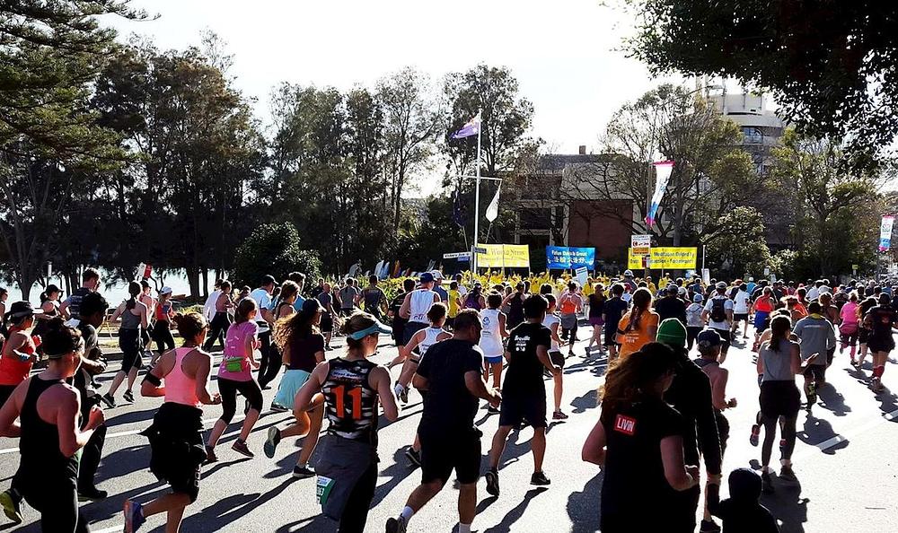 Dok je velika grupa maratonaca u sklopu humanitarne manifestacije "City to Surf" u jutarnjim satima 12. avgusta 2018. trčala ulicama Sydneyskog Rose Baya, ugledali su nešto neočekivano: praktikante Falun Gonga u žutim majicama i transparentima sa natpisima "Svijetu treba Istinitost-Dobrodušnost-Tolerancija" i " Falun Dafa je sjajan".