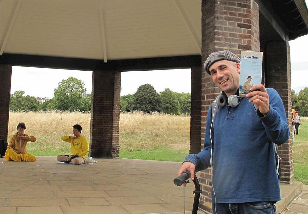 "Ovo je pravi mir", rekao je. "Znate li koliko su zaposleni Londonci i pod koliko velikim stresom ti ljudi žive." Rekao je da je čitao knjige o budizmu, hinduizmu i jogi i da je prirodno osjetljiv na energiju. Njegova intuicija mu je rekla da Falun Gong nije običan.