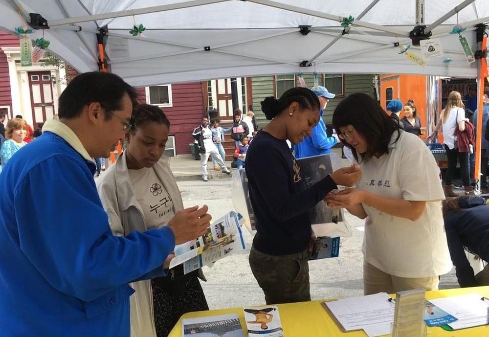 Ljubiteljka yoge je dugo vremena razgovarala sa praktikantima. Bila je sretna kad je saznala da je Falun Gong nije samo fizička vježba, već da također ima i duhovnu komponentu koja podučava principima Istinitosti-Dobrodušnosti-Tolerancije. Snimila je sliku praktikantskog transparenta i rekla da će je podijeliti sa svojim prijateljima.