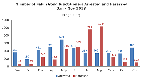 Prema podacima dostupnim našem portalu, u novembru 2018. godine je u Kini zabilježeno 486 slučajeva hapšenja praktikanata Falun Gonga, a dodatnih103 praktikanta su maltretirali zbog njihove vjere.