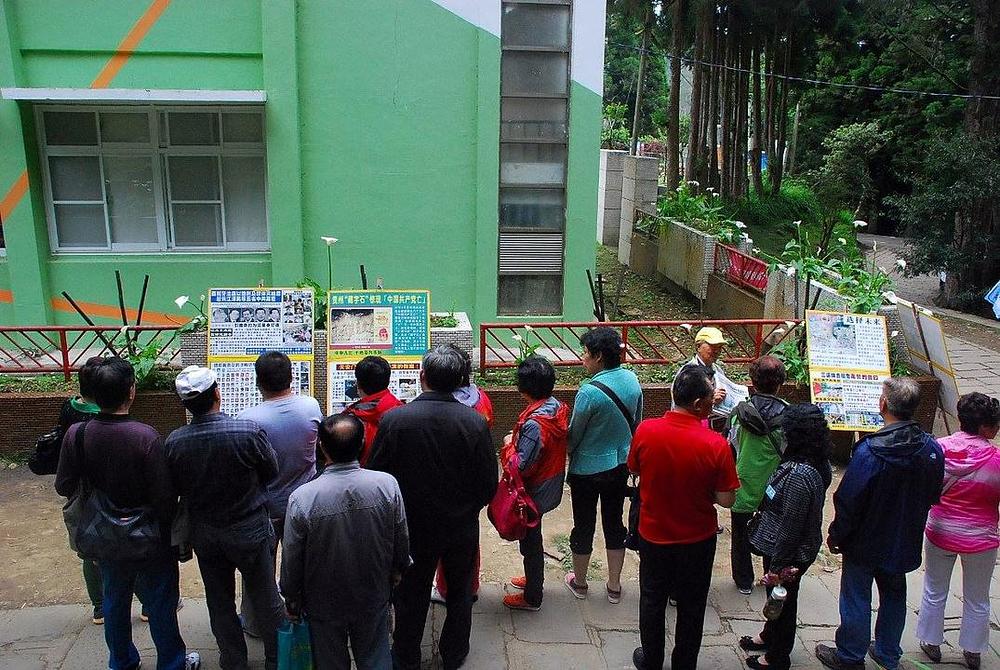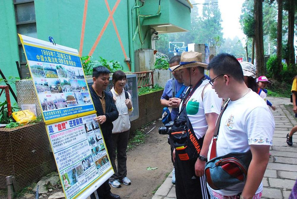 "Dobrodošli u Alishan", kazalo je nekoliko praktikanata grupi kineskih turista, koji su išli kamenom stazom do muzeja. "Saznajte istinu o Falun Gongu i istupite iz Partije da možete zauzeti stav protiv njenih brutalnih zločina usmjerenih protiv nevinih građana."