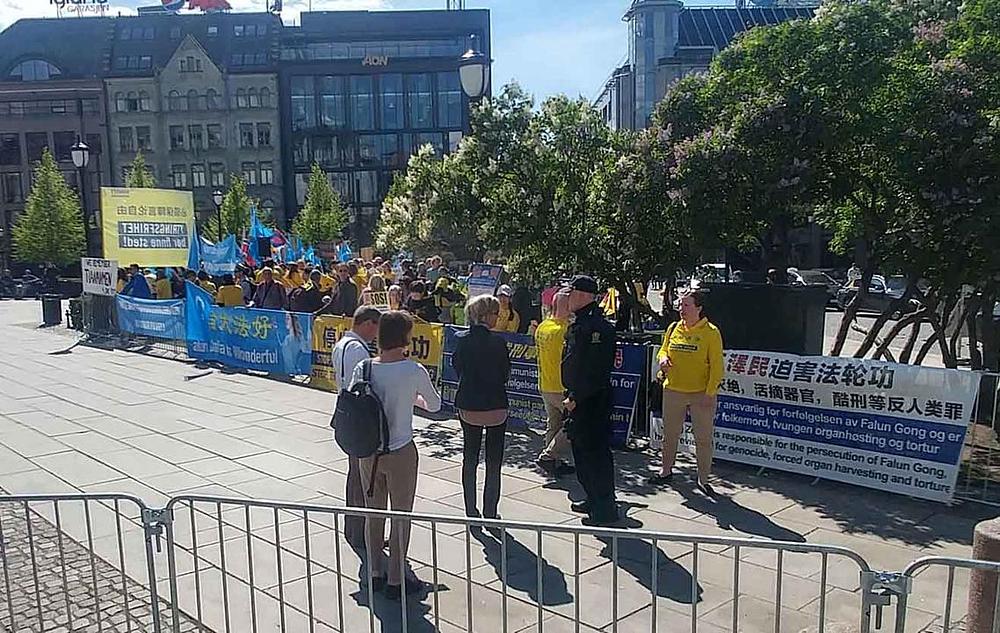 Kada je predsjednik kineskog nacionalnog narodnog kongresa, Li Zhanshu, posjetio Norvešku u maju mjesecu da bi se sastao s političarima i poslovnim ljudima, 15. maja je na Brdu parlamenta naišao na mirni protest Falun Gong praktikanata. Praktikanti su nosili transparente sa natpisima "Falun Dafa je dobar“ i „ Zaustavite progon Falun Gonga“, što je jako privuklo pažnju prolaznika. Oni su tom prilikom također podijelili i veliki broj letaka koji su razobličavali progon, posebno prisilnu žetvu ljudskih organa, od zatvorenika savjesti u Kini, koju odobrava kineska država. Mnogi su ljudi uzeli letke, razgovarali sa praktikantima i izrazili podršku miroljubivom otporu praktikanata.