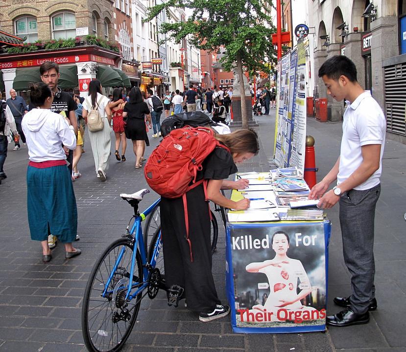 S približavanjem ljeta turisti sve više posjećuju London. Falun Dafa praktikanti su postavili sto u londonskoj Kineskoj četvrti kako bi predstavili ovu drevnu kinesku praksu meditacije i javnosti govorili o brutalnom progonu Falun Dafa (poznatom i pod nazivom Falun Gong) u Kini. Mnogi su se posjetioci zaustavili kraj praktikantskog stola želeći saznati više o Falun Dafa i situaciji u Kini. Također je i veliki broj ljudi potpisao peticiju kojom se poziva na okončanje progona. I vikend 1. juna 2019. godine nije u tome bio izuzetak.