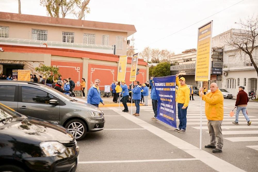 Falun Gong praktikanti iz Argentine okupili su se ispred kineskog veleposlanstva 18. srpnja 2019. godine, kako bi pozvali na okončanje progona. Neki praktikanti su pokazivali vježbe ili držali transparente, dok su drugi dijelili letke i razgovarali o progonu s prolaznicima.