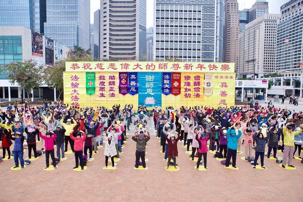 Praktikanti iz Hong Konga su se, 1. januara, okupili na trgu Edinburgh u Središnjem distriktu, gdje su slavili Novu godinu i sa skupa zaželjeli sretnu Novu godinu gospodinu Li Hongzhiju, osnivaču Falun Dafa.