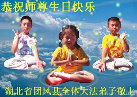 Među čestitkama koje pristižu iz provincije Hubei je i čestitka jedne obitelji praktikanata iz Tuanfeng okruga, grada Huanggang u kojoj su napisali: " Poštovani Učitelji, sa svakim dolaskom Vašeg rođendana nas obuzmu emocije, jer nakon tisuća godina čekanja, napokon smo primili Dafa univerzuma kojeg je stvorio Učitelj. Također smo tužni zbog klevete od strane zlobne partije i napada starih sila. Učitelj je pretrpio jako puno za nas."