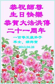 Praktikanti iz grupa za učenje Fa u Daxingu, u Pekingu s poštovanjem žele milostivom velikom Učitelju sretan 62. rođendan i slave 21. godišnjicu predstavljanja Falun Dafa u javnosti!