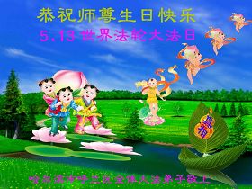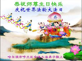 Praktikanti u sledećim distriktima i okruzima u Harbinu slave Svetski dan Falun Dafe i 21. godišnjicu predstavljanja Dafe javnosti, i s poštovanjem žele milostivom Učitelju srećan rođendanan!