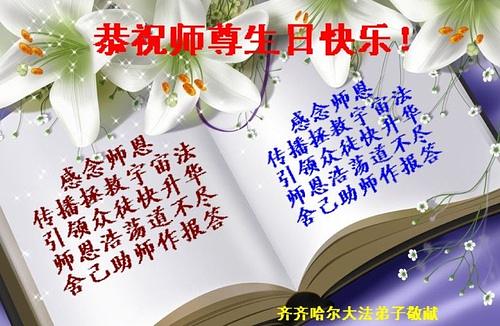 Praktikanti iz sljedećih distrikta u gradu Qiqiharu, u provinciji Heilongjiang slave Svjetski Falun Dafa dan i 21. obljetnicu predstavljanja Falun Dafa u javnosti! S poštovanjem žele milostivom velikom Učitelju sretan rođendan!