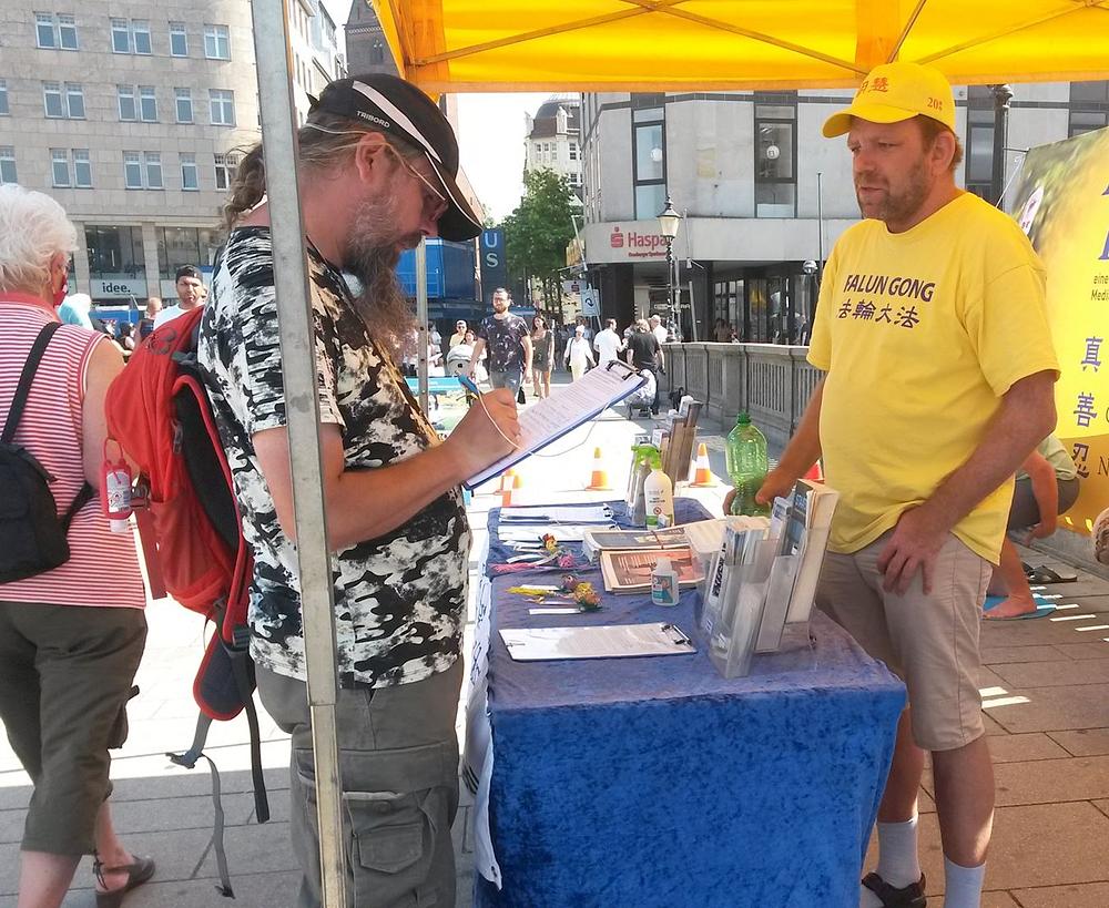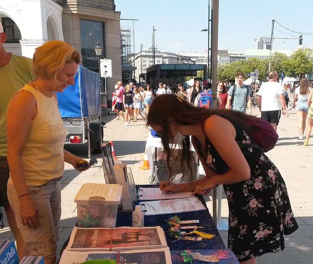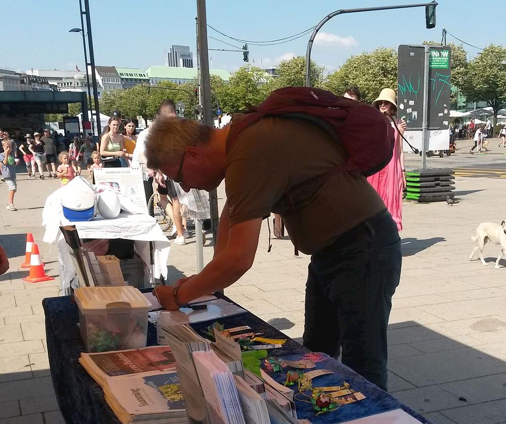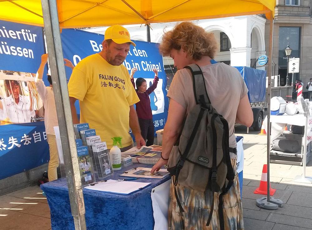 Žena koja je potpisala peticiju je kazala da već od ranije zna za progon Falun Gonga u Kini. Ispostavilo se da je njena maćeha bila Kineskinja, pa je ova žena često odlazila u Kinu. Posljednji put kad je otišla tamo je ostala šest mjeseci. „Čula sam da se tamo za dvije nedelje može pronaći donor jetre. To je nevjerovatno. U Njemačkoj biste za tako nešto morali čekati 10 godina “, rekla je. Ona je praktikantima poželjela sve naj bolje.