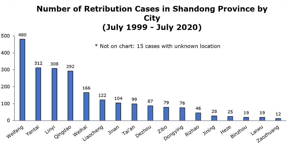 Osim 15 slučajeva čije lokacije nisu poznate, preostalih 2.274 slučajeva odmazde odnosilo se na počinitelje iz svih 17 gradova provincije Shandong. Weifang je imao najviše slučajeva (480), zatim slijedi Yantai (312) i pet drugih gradova s trocifrenim brojem slučajeva.