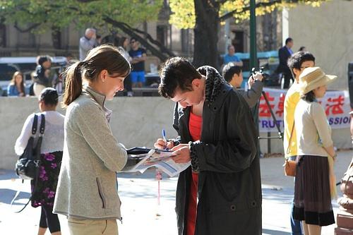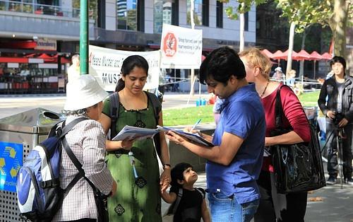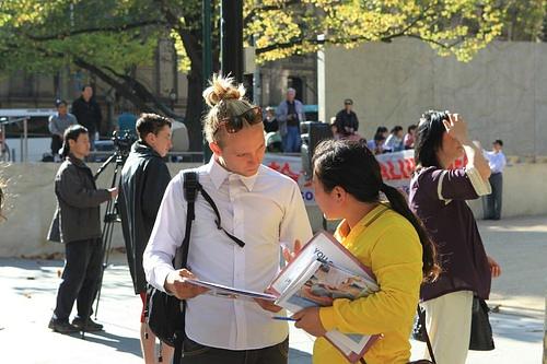 Falun Gong praktikanti, gospođa Ti Na i gospodin Liu Jun su okupljenima govorili o brutalnom progonu kojeg su pretrpjeli u Kini i razotkrili su laži koje govori Komunistička Partija Kine i kako KPK krši zakon.