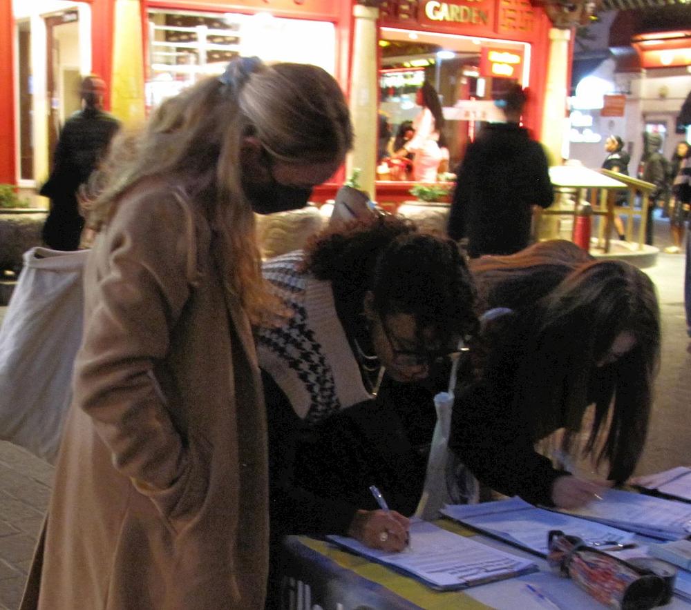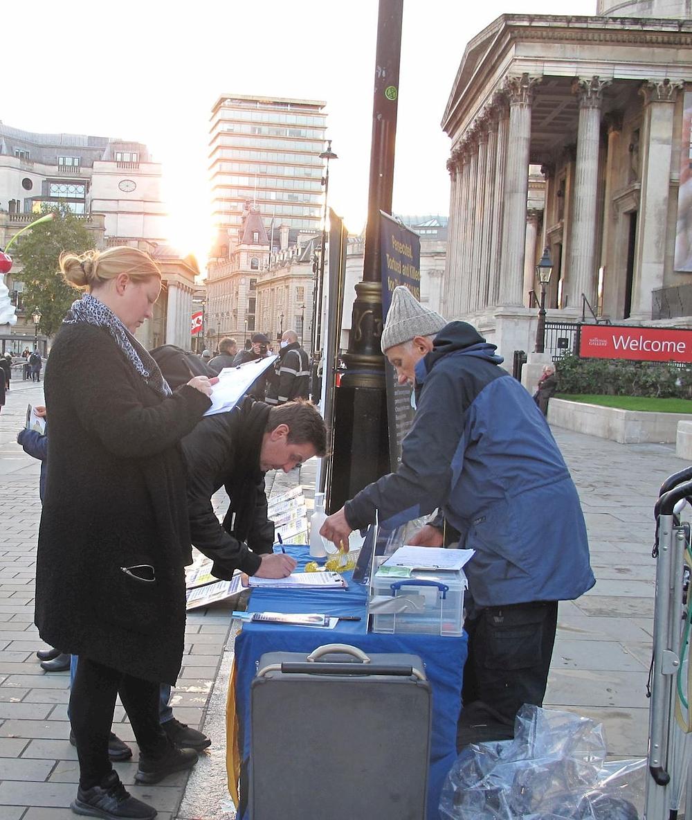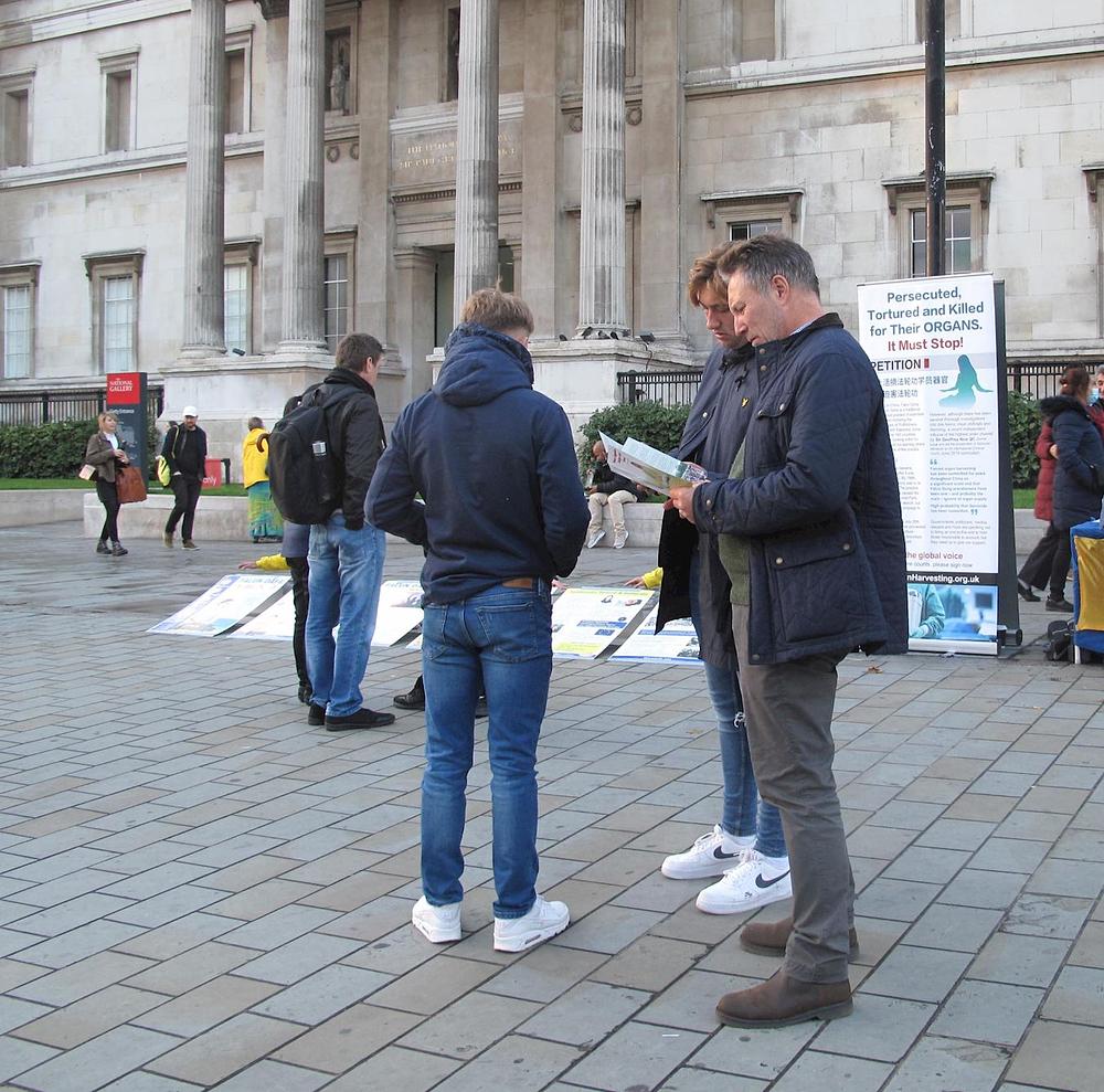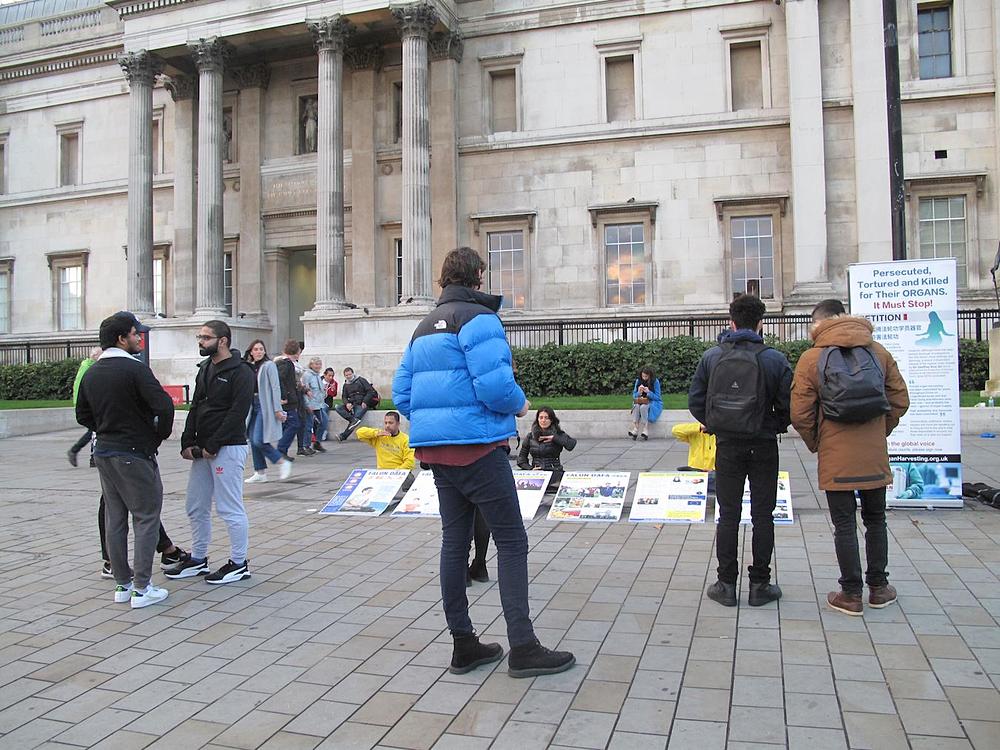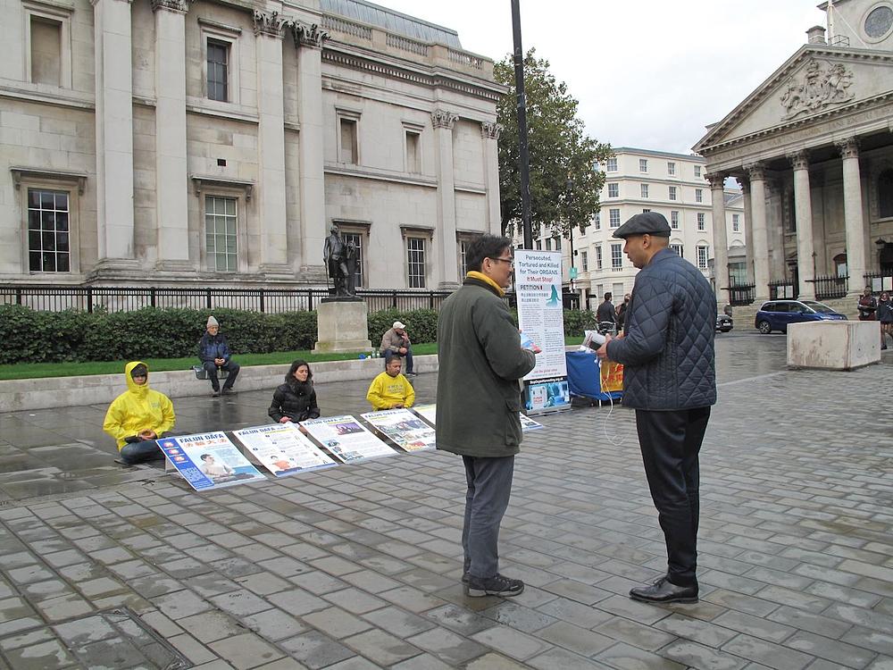 Praktikanti Falun Gonga su 10. oktobra 2020. godine otišli na Trafalgar Square i u Kinesku četvrt u Londonu, kako bi ljudima govorili o Falun Gongu i kako bi što veći broj ljudi upoznali sa aktuelnim progonom Falun Gonga u Kini. Mnogi su se prolaznici zaustavili na njihovom informativnom štandu u želji da postave neka pitanja i kako bi potpisali peticiju kojom izražavaju podršku naporima praktikanata.