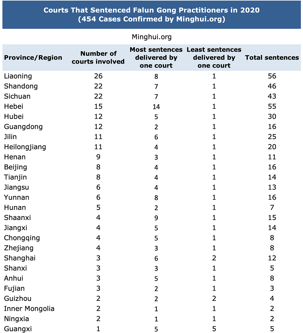 Dostupne informacije pokazuju da je ukupno 208 sudova bilo uključeno u izricanje presuda za 454 praktikanata (73%), pokazujući da je pravosudni sistem širom Kine široko uključen u progon, uključujući okružne, gradske, okružne i gradske sudove.