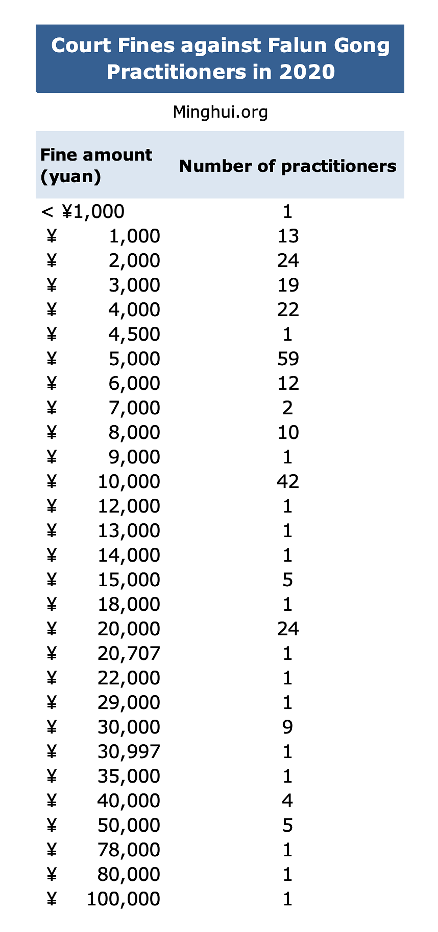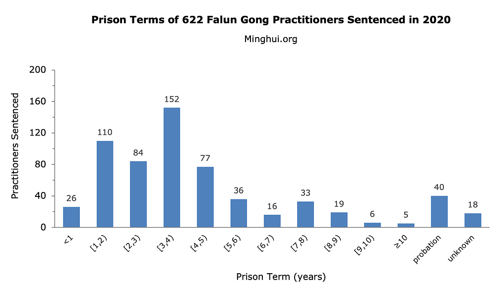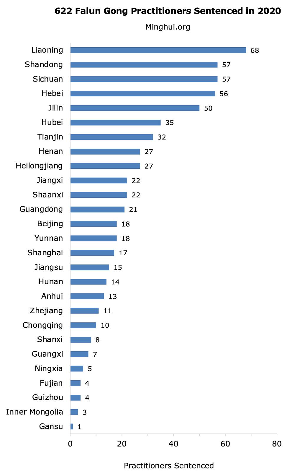 Prema podacima koje je prikupio Minghui.org između 1. januara i 31. decembra 2020. godine, ukupno je u 2020. godini osuđeno 622 Falun Gong praktikanta. Nakon što je u januaru 2020. osuđeno 47 praktikanata, veći dio Kine je bio zaključan zbog pandemije i mjesečni slučajevi izricanja kazne su se kretali oko 20. između februara i maja mjeseca.