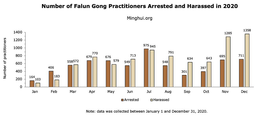 Prema informacijama koje je prikupio Minghui.org, 2020. godine je bilo uhapšeno 6.659 praktikanata, a maltretirano je 8.576 osoba. Iako je broj hapšenja ostao sličan broju od 6.109 iz prethodne godine, 2020. godine je broj slučajeva maltretiranja porastao 2,4 puta u odnosu na 3.582 u 2019. godine.