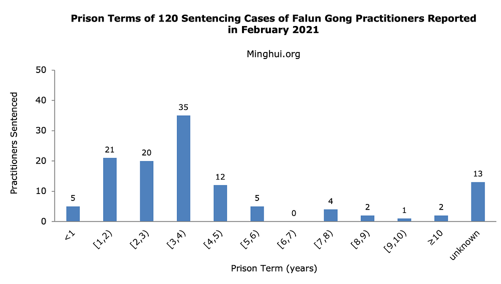 U februaru mjesecu 2021. godine Minghui.org je potvrdio da je još 120 Falun Gong praktikanata osuđeno zbog svoje vjere, a to uključuje i 47 praktikanata osuđenih u 2020. godini, 12 u januaru 2021. i 61 u februaru 2021. godine.