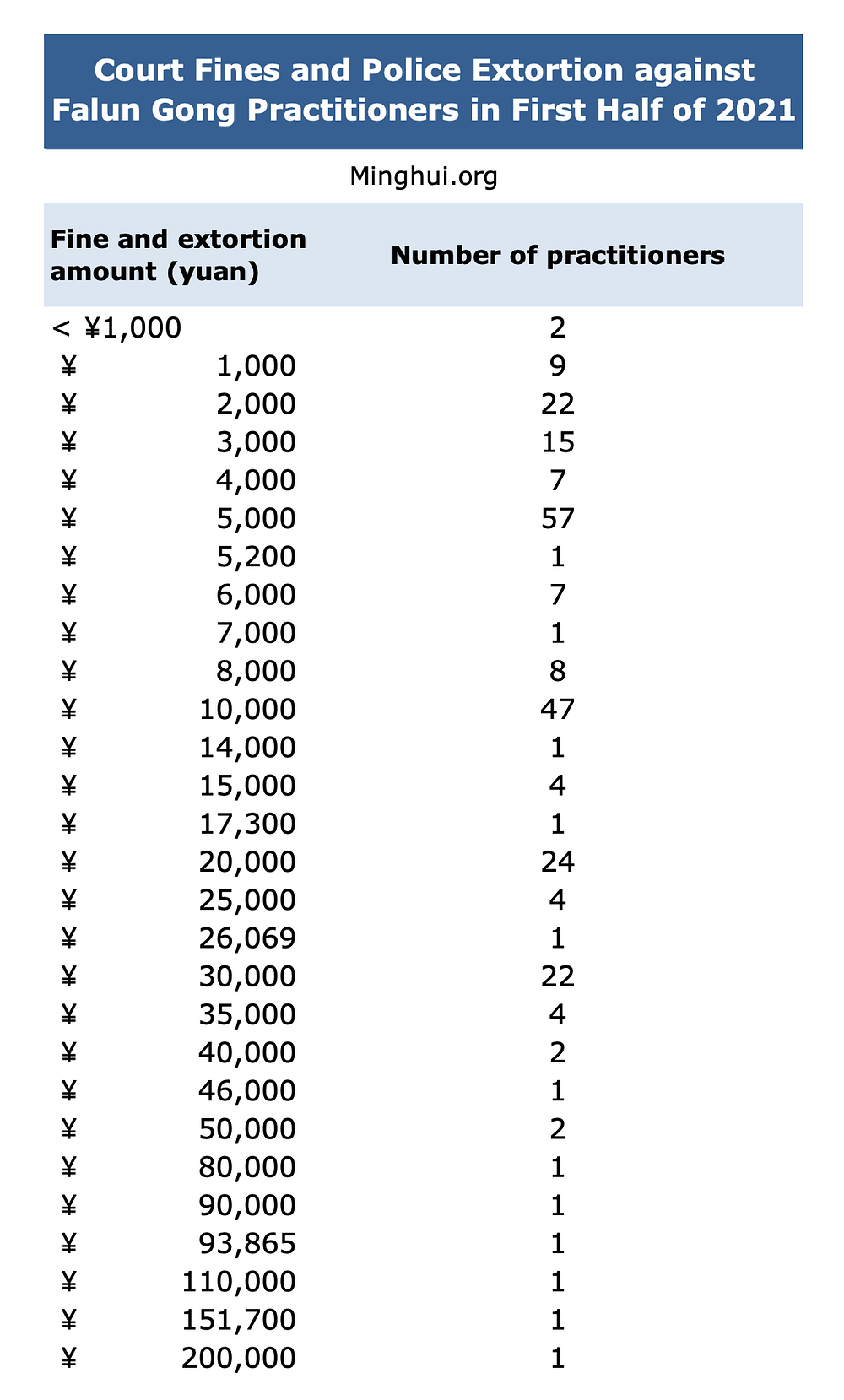 Ukupno je od 248 (37%) praktikanata policija iznudila ili ih je sud kaznio novčanom kaznom u iznosu od 500 do 200.000 yuana, ili prosječno 13.909 yuana po osobi.