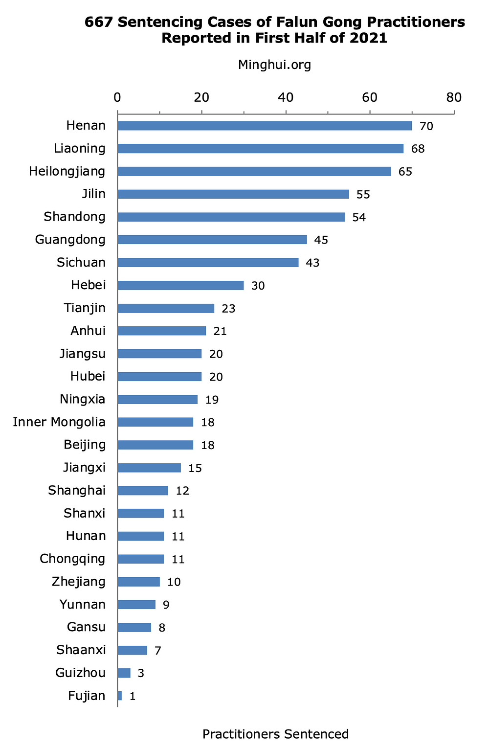 U prvoj polovini 2021. godine potvrđeno je da je 667 Falun Gong praktikanata osuđeno na zatvorske kazne zbog svoje vjere u duhovnu disciplinu koja je na meti progona kineskog komunističkog režima još od 1999. godine.