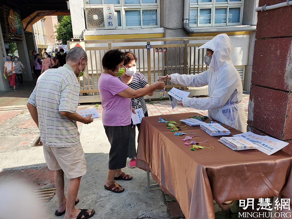 Početni plan je zapravo bio objašnjavanje istine u blizini ureda za prijavu poreza Xindian upravnog centra. No, tada smo vidjeli kako se gomila okuplja u Domu zdravlja okruga Xindian. "Danas u centru nema planiranog cijepljenja", pomislio sam. No bilo je dugih redova ljudi i saznali smo da je nadležna četvrt zakazala ta cijepljenja pa to nije objavljeno na web stranici. Zahvalio sam se svakom čelniku zajednice susjedstva na predanom služenju susjedstvu, dao sam im za uspomenu cvijet lotosa i primjerak posebnog izvješća o tome kako je svijetu potrebna Istinitost-Suosjećanje-Strpljenje i poželio im mir i sigurnost. Neki od njih su uzviknuli: "Pa ovo je tako dobro!" Ja znam da je njihova strana koja razumije istinu, bila zahvalna na Učiteljevom osnaživanju i lotosovom cvijeću koje su ručno izradili praktikanti Dafa.