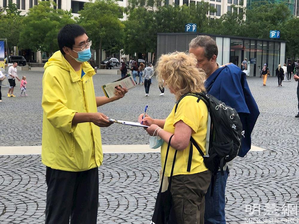 Šezdesetogodišnjakinja se poželjela više informirati o progonu Falun Gonga. Komentirala je: „Nakon što sam vidjela transparente o komunističkoj partiji i žetvi organa, odmah sam došla ovdje. Dolazim iz bivše istočne Njemačke i znam koliko pritiska i štete može ljudima učiniti takav politički sistem.“