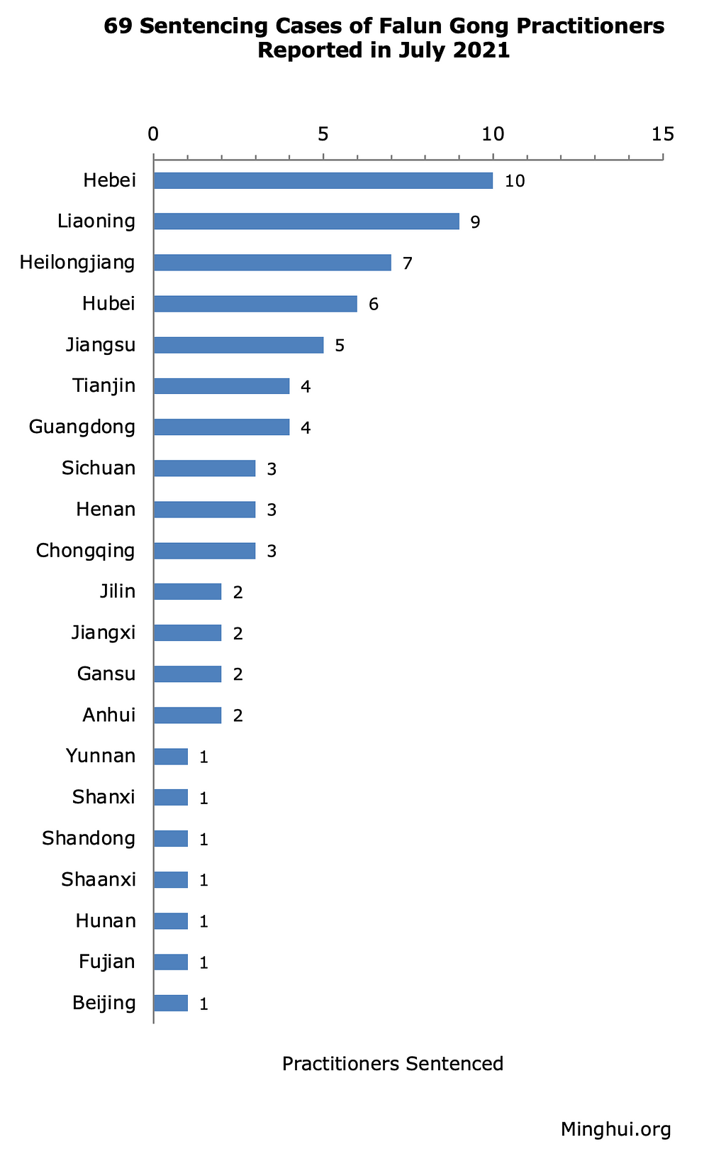 Tokom jula 2021. godine na Minghui.org pristigle su informacije iz Kine da je dodatnih 69 praktikanata Falun Gonga bilo osuđeno zbog svoje vjere.