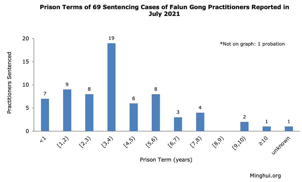 Među 69 novo prijavljenih osuda o kojima je obaviješten Minghui.org, 7 se desilo 2020. godine, 30 je zabilježeno u prvoj polovini 2021. godine, 28 u julu mjesecu 2021. godine, kao i 4 slučaja koji su se dogodili 2021. g, ali izvori nisu mogli navesti točan mjesec. Ove nove informacije su učinile da ukupan broj poznatih kazni koje su se dogodile 2021. godine iznosi 451, što čini 61,3% od 736 prijavljenih slučajeva. Preostalih 285 prijavljenih slučajeva se odnose na 278 slučaja koji su se dogodili 2020. godine (37,7%) i 7 slučaja 2019. (1%).