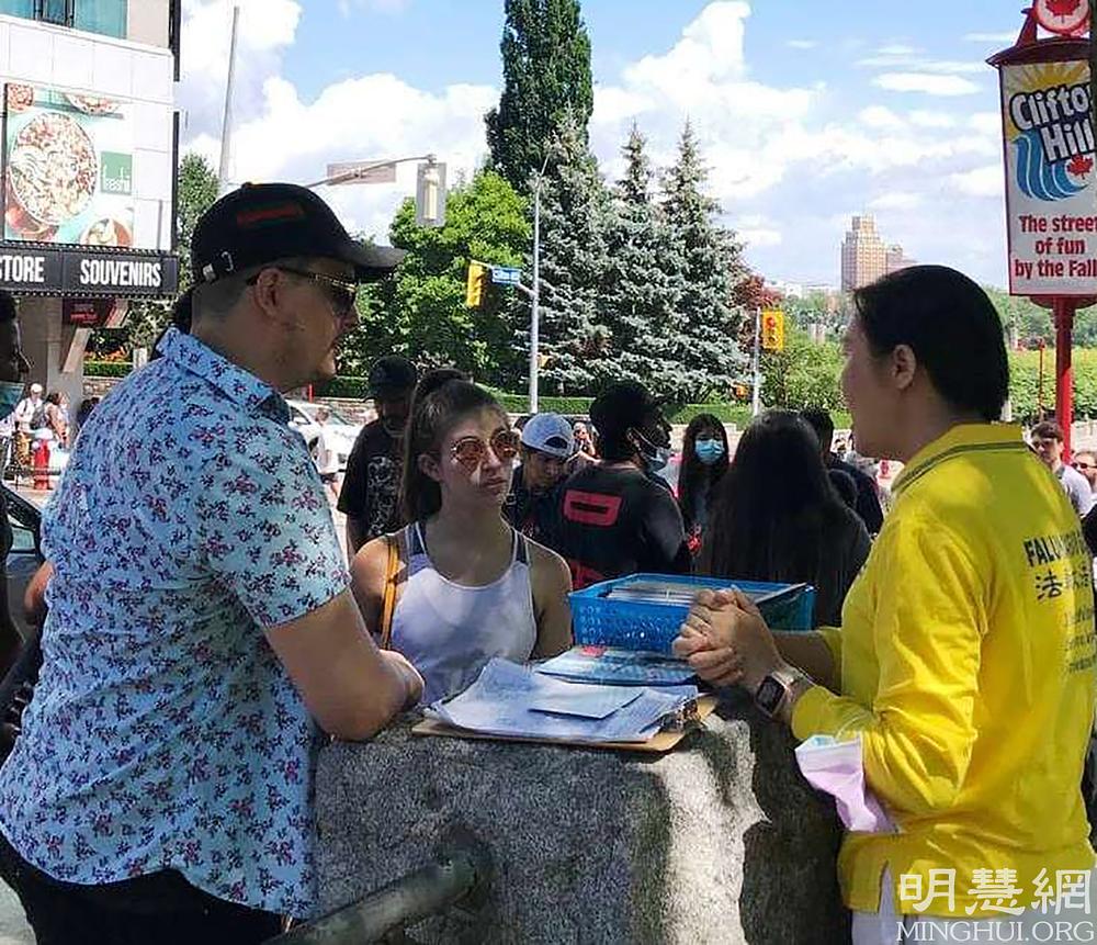 Falun Dafa praktikanti iz Toronta u Kanadi već godinama održavaju mjesto za grupno prakticiranje na slikovitim slapovima Nijagare, koje posjećuju turisti iz cijelog svijeta. Vježbalište je otvoreno svaki dan i privlači mnoge posjetitelje.