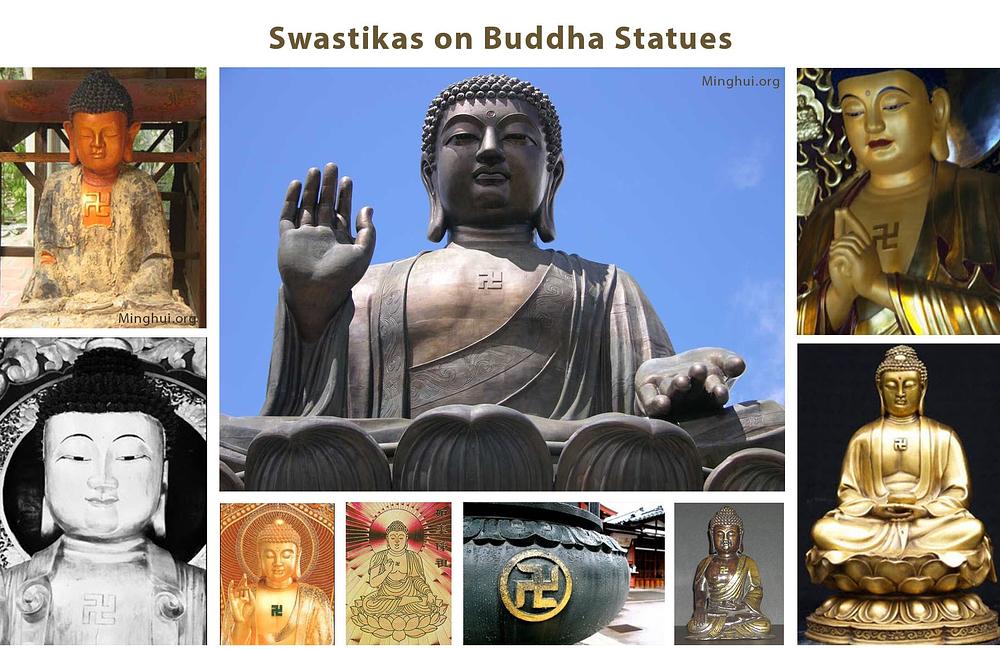 Ispod je nekoliko fotografija kipova Buddha na kojima se nalaze simboli swastike