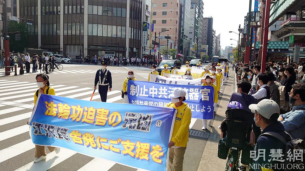 Dvosatna komemorativna procesija krenula je iz parka Hanakawato u Asakusi, a prošla je kroz mnoge prometne četvrti Tokija. Policijski automobili su vodili put, a slijedili su ih Tian Guo Marching Band i praktikanti koji su držali transparente. Nekoliko je praktikanata dijelilo informacije duž rute parade i skupljalo potpise na peticiji za okončanje zločina koji se događaju u Kini.