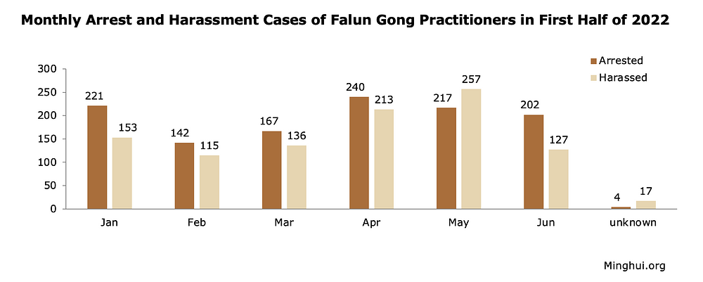 Prema informacijama koje je prikupio Minghui.org, u prvoj polovici 2022. prijavljeno je 2707 slučajeva uhićenja ili maltretiranja Falun Gong praktikanata zbog njihove vjere.