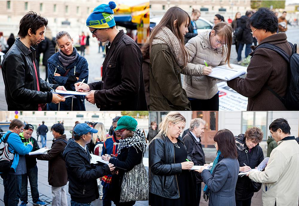 Falun Gong praktikanti u Švedskoj su 26. listopada 2013.g. organizirali potpisivanje peticije na Mynttorget trgu, u blizini kraljevske palače u Stockholmu, kako bi se osudio 14 godina dug progon Falun Gonga od strane Komunističke partije Kine (KPK). Praktikanti su također objašnjavali istinu prolaznicima i pokazivali pet Dafa vježbi.