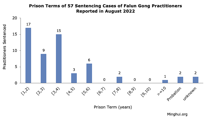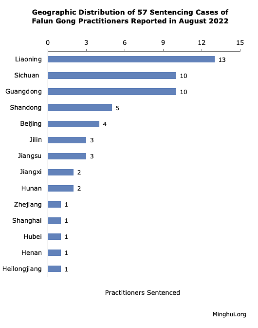 U avgustu mjesecu 2022. godine, registrovano je i potvrđeno pedeset sedam slučajeva osuđivanja Falun Gong praktikanata zbog njihove vjere uključujući pet slučajeva koji su se desili 2021. i 52 slučaja 2022. godine (uključujući po jedan u januaru, martu i maju i 13 u junu, 11. julu i 25. u avgustu).