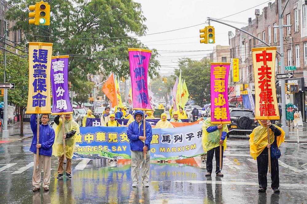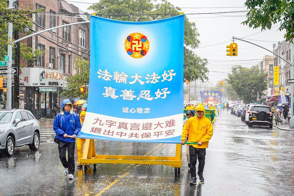 Zastave i transparenti su, 2. oktobra 2022. godine, ispunili 8. aveniju u Bruooklynu u New Yorku, a okolne zgrade su odjekivale od zvukova gongova i bubnjeva. Više je od 1.000 Falun Dafa praktikanata održalo veliku paradu po kiši kako bi ljude upoznali sa dvadeset trogodišnjim progonom njihove miroljubive kultivacijske prakse u Kini. Parada je održana i kako bi se odalo priznanje za 400 miliona Kineza koji su napustili Komunističku partiju Kine (KPK) i njene pridružene organizacije. Mnogi prolaznici su se zaustavljali da gledaju paradu i dobiju informacije o brutalnom progonu.